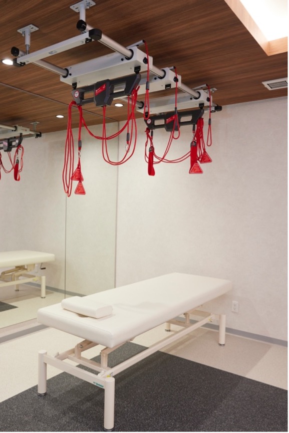 当院のリハビリテーション室は広々とした空間を確保しており、周囲を気にせずにリハビリに集中していただけます。患者さまが「ここなら頑張れる」と思えるような空間づくりを大切にしています。また、治療機器も充実しており、全身をバランスよく鍛えられるケーブルマシンや、深部の関節や筋肉にアプローチできるフィジオ5D、血流改善・疼痛緩和を図る超音波治療器などを備えています。症状や生活スタイルに合わせて、治療器を組み合わせ、リハビリに役立てています。