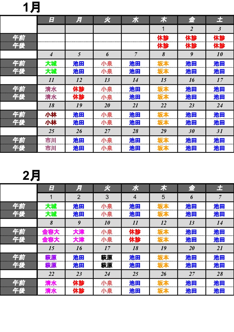 1月、2月の日別診察担当医表の掲載