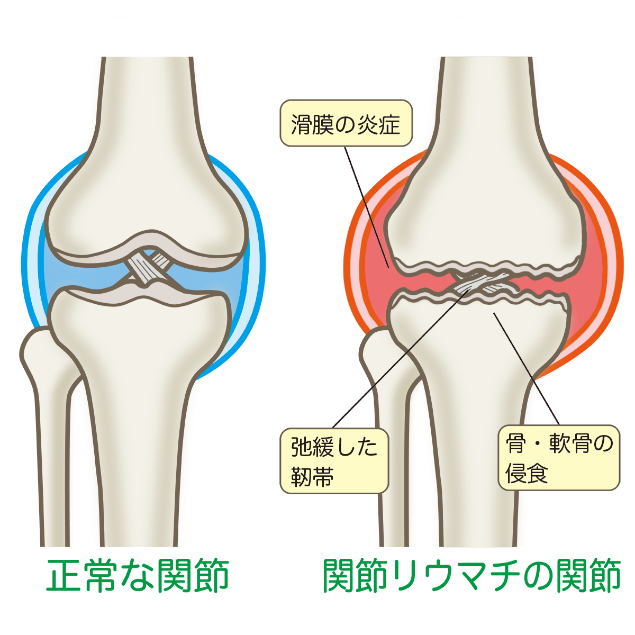 関節に慢性的な炎症が起こり、腫れや痛み、こわばりが続く病気です。発症のピークは30~50代女性ですが、高齢者や男性にもみられます。進行すると手足の小さな関節が変形・動かしにくくなりますが、近年は早期発見と適切な治療により進行を抑えることができるようになりました。発症から2年以内に進行しやすいことが分かっているため、早期発見・早期治療が重要です。